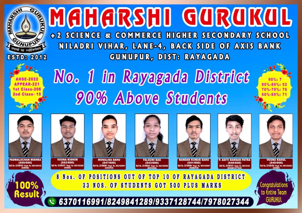 ଏଥର ସମ୍ଭାଳ ବ୍ୟୁରୋ(ଗୁଣପୁର)- ଆଜି +୨ ବିଜ୍ଞାନ ଫଳାଫଳ ବାହାରିଛି । ସ୍ଥାନୀୟ ଗୁଣୁପୁର ର ମହର୍ଷି ଗୁରୁକୂଳ ର ଛାତ୍ର ଛାତ୍ରୀ ମାନେ ବାଜିମାତ କରିଛନ୍ତି । ଅନୁଷ୍ଠାନ ରୁ ମୋଟ ୨୨୧ ପରୀକ୍ଷାର୍ଥୀ ଙ୍କ ମଧ୍ୟରୁ ୨୦୬ ଜଣ ପ୍ରଥମ ସ୍ଥାନ ଓ ୧୫ ଜଣ ଦ୍ୱିତୀୟ ସ୍ଥାନ ଅଧିକାର କରିଛନ୍ତି । ସମଗ୍ର ଜିଲ୍ଲା ରେ ୧୦ ଜଣ ୯୦ ପ୍ରତିଶତ ନମ୍ବର ରଖିଛନ୍ତି ସେଥିମଧ୍ୟରୁ ଅନୁଷ୍ଠାନ ପକ୍ଷରୁ ସର୍ବାଧିକ ୭ ଜଣ ୯୦ ପ୍ରତିଶତ ନମ୍ବର ରଖିଛନ୍ତି । ଜିଲ୍ଲାର ଟୋପ ୧୦ ରେ ୮ ଜଣ ଏହି ଅନୁଷ୍ଠାନ ରୁ ସଫଳତା ହାସଲ କରିଛନ୍ତି । ୩୩ ଜଣ ଛାତ୍ର ଛାତ୍ରୀ ୫୦୦ ରୁ ଅଧିକ ନମ୍ବର ରଖି ଅନୁଷ୍ଠାନ ର ଟେକ ବଜାୟ ରଖି ଛନ୍ତି । ଅନୁଷ୍ଠାନ ର ପଦ୍ମ ଲୋଚନ ମିଶ୍ର ୫୫୫ ନମ୍ବର ରଖି ଅନୁଷ୍ଠାନ ର ପ୍ରଥମ ସ୍ଥାନ ଅଧିକାର କରିଛନ୍ତି । ଅନୁଷ୍ଠାନ ର ପରିଚାଳନା କମିଟି ଏହି ସଫଳତାର ଶ୍ରେୟ ସବୁ ଛାତ୍ର ଛାତ୍ରୀ, ଅବିଭାବକ ଓ ଷ୍ଟାଫ ମାନଙ୍କ ପାଇଁ ବୋଲି କହିଛନ୍ତି ।ଏହି ସମଗ୍ର ଟିମ ର ଅକ୍ଲାନ୍ତ ପରିଶ୍ରମ ର ଫଳ ବୋଲୀ ମତ ପ୍ରକାଶ କରିଛନ୍ତି ।